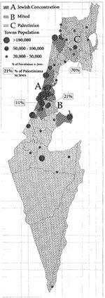 Figure I: Jewish and Palestinian Concentration in Israel Area A, with two-thirds of Israel's Jewish population, is essentially the same land in which Jews lived in pre-1948 Palestine. Area B is mixed, where Palestinians and Jews live, Almost 80 percent of the country's Jews live in Areas A and B. Area C represents largely the land and heritage of 5 million refugees who are denied the right to return home. Only 160,000 rural Jews live there, in addition to 863,000 urban Jews who live in cities that were originally Palestinian.
