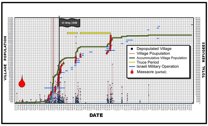استمرت عمليات الطرد والترحيل. وتم تدمير 675 بلدة. وقد تزامنت كل عملية طرد وترافقت مع عملية عسكرية إسرائيلية أو مع احتلال جديد. وعندما كانت هناك فترة هدوء، لم يكن أحد يغادر، كما ترون. وإذا كان الناس قد غادروا حسب أوامر العرب كما تقول إسرائيل، فإن الهدنة أو توقف القتال كانت ستشكل وقتاً مناسباً لحزم الأمتعة والمغادرة، لكنهم لم يفعلوا، كما ترون من المنحنى المستوي. وهذا ينسف الأسطورة القائلة بأن الخروج الفلسطيني العظيم لم يكن بسبب الإسرائيليين.
