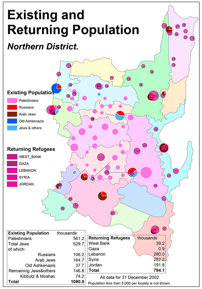 الخريطة 6 الخريطة 7 يمكننا أن نذهب إلى أكثر بكثير من التفاصيل. خذوا المنطقة الشمالية من الجليل. لقد أجرينا دراسة على البلدات الإسرائيلية، من يعيش هناك اليوم. وقد صنفناها إلى خمس فئات (الخريطة 6). ثم سمحنا للناس المشردين بالعودة إلى بيوتهم. وكما ترون، ليست هناك مشكلة في اللوجستيات ولا تعارض.