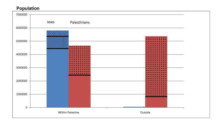 اليهود 7.5 مليون أقصى حد، قد يهاجر بعضهم والباقي 4. هناك سيناريوات متعددة لا مجال لذكرها الآن. الفلسطينيون 18 مليون 9 في الداخل، و9 حول الحدود، هذا إذا لم تتم عودتهم إلى الوطن.