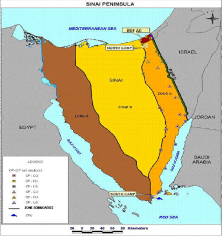 وحسب معاهدة السلام، فإن مصر استرجعت السلطة المدنية الكاملة على سيناء واسترجعت سلطة عسكرية محدودة عليها حسب 4 قطاعات، شمالية جنوبية، قسمت سيناء عسكرياً بحيث يكون أقل تواجد عسكرى مصرى على القطاع الملاصق لإسرائيل وأكثره شرق قناة السويس ولكنه ليس كاملاً في كل الحالات.