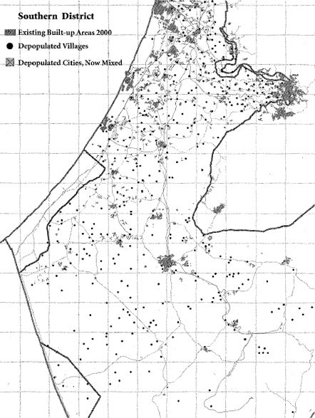 Figure III:Existing Built-Up Areas in 2000-Southern District When the refugees return to the south, they will find it almost empty, except for a few towns. All rural Jews, in 14,000 square kilometers, would fill only a single refugee camp; while the density in Gaza is 5,500 persons per square kilometer, Jewish rural density is 6 persons per square kilometer. Return of the refugees will hardly be felt at the center.