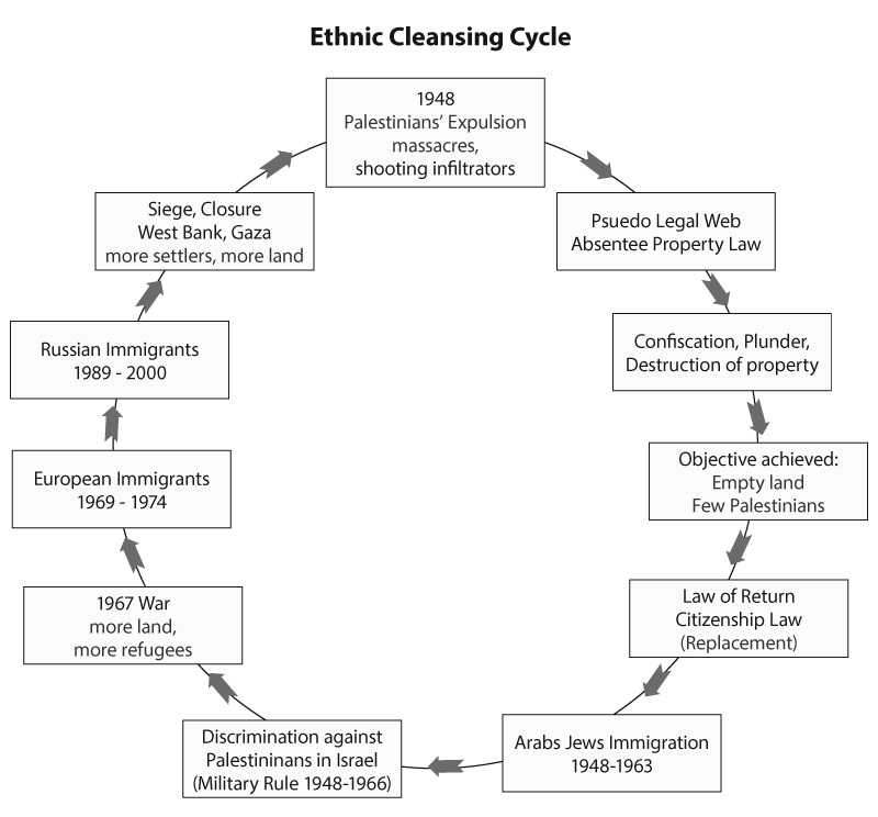 By a mixture of Israeli promises and coercion, a total of 2.9 million immigrants has been imported into Israel over the past 50 years, in order to replace the Palestinians who are the rightful national majority and owners of the country. Words cannot be more eloquent than these figures in showing the reality of the policy of ethnic cleansing that Israel has carried out over the past half century, a policy that saw but its latest episode in the horrific atrocities lately committed in Jenin.
