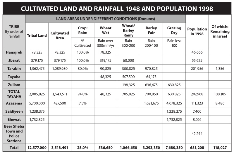 Other estimates for cultivated areas, based on rainfall figures, gave a minimum of 3,750,000 dunums and a maximum of 5,500,000 dunums plus about 750,000 dunums for grazing. Still, this is considerably less than the total area which receives rainfall from above 300 to 100 mm/year. Areas by maximum rainfall are by measurement: above 300 mm/year (1,042,250 dunums); 300-200 mm/year (2,080,000 dunums); and 100-200 mm/ year (5,784,000 dunums). The total area of rainfall in the Beer Sheba district thus amounted to 8,900,000 dunums. Aerial surveys of the heavily populated northern half of the district taken by the British Royal Air Force between 1945 and 1946 show intensive and close cultivation. It is thus evident that the regularly cultivated land in the Beer Sheba district owned by Arab clans was not less than 5,500,000 dunums of which 3,750,000 dunums was cultivated annually. Total land utilized for cultivation at one time or another for grazing was around 8,900,000 dunums. So much for the Zionist myth that the land in southern Palestine was not cultivated.