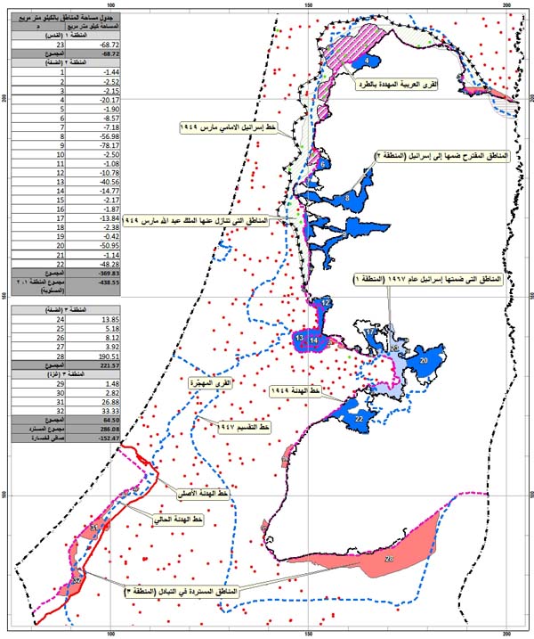 A study of the Olmert draft as it is shows that, in fact, it proposes the confiscation of Palestinian property located between the apartheid wall and the 1949 armistice line, including East Jerusalem, which means it considers Israel's new borders to be the path of the wall itself (see the map). This means adding around 370 sq km from the West Bank to Israel in addition to the 68 sq km annexed from Arab Jerusalem in 1967, making a total of 438 sq km of territory.