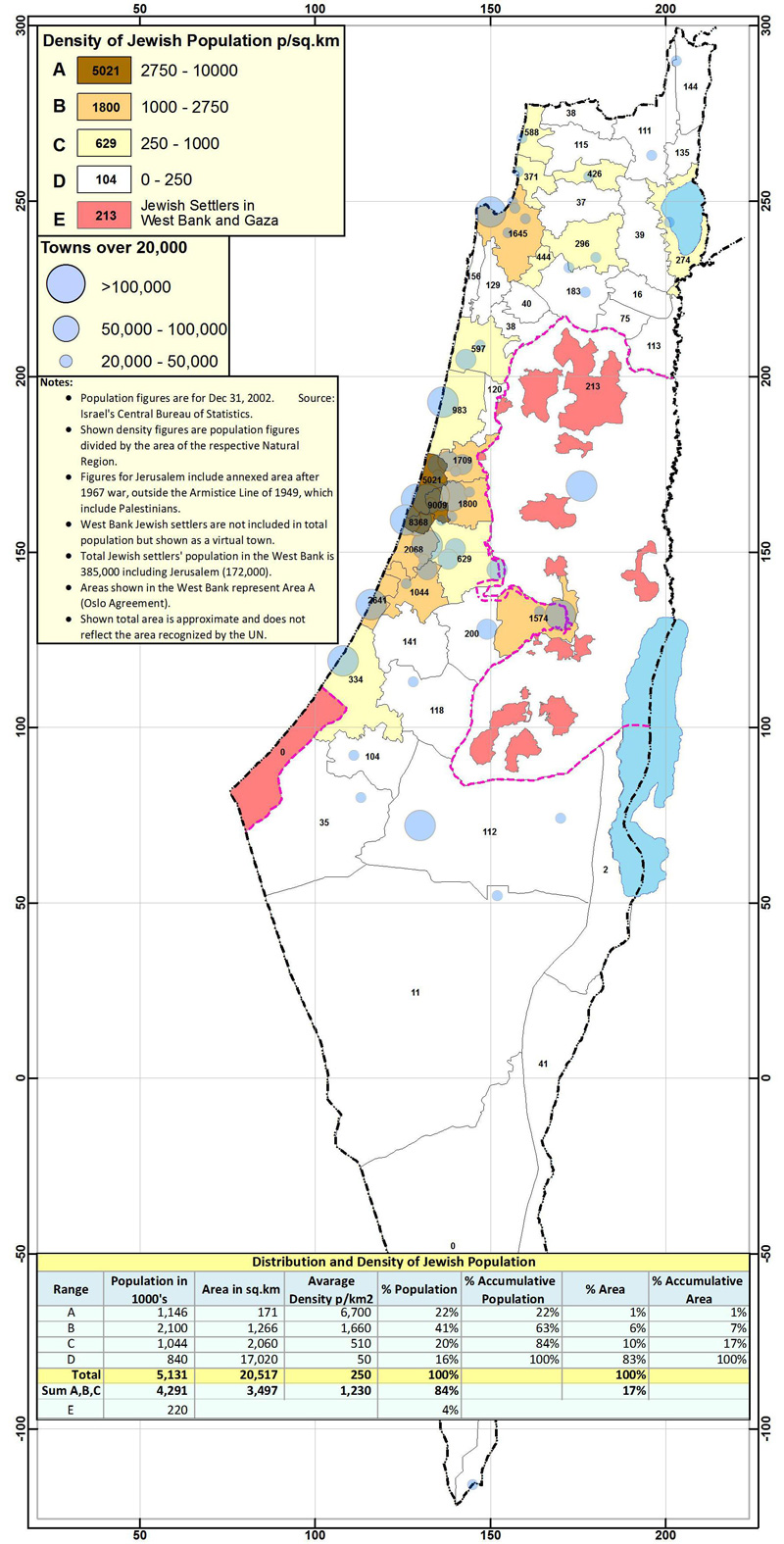 The first question to ask is: what did Israelis do with the Palestinian land, 93 percent of Israel’s area (20,500 sq. km.)? As [Map-3] clearly shows, 63 percent of Israeli Jews live in 7 percent of Israel and 84 percent live in 17 percent of Israel. The 17 percent is even a bit generous: Israeli figures cite 12 percent. In fact, the urban area is only 2.5 percent of the area. Israeli Jews congregate in urban areas in and around the territory they acquired during the Mandate.