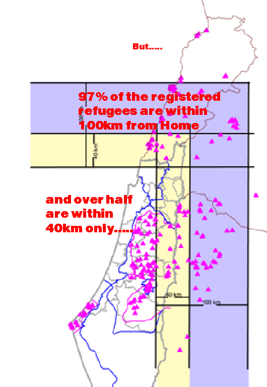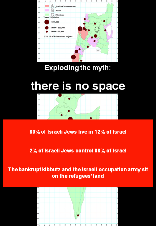 Another myth: there is no room for returning refugees. Wrong. The truth is 80% of the Israeli Jews live in 14% of Israel. The rest is refugee land inhabited by the Kibbutz and the army. It seems Israel finds room only for one million Russians, equal in number to all refugees in Gaza and Lebanon.
