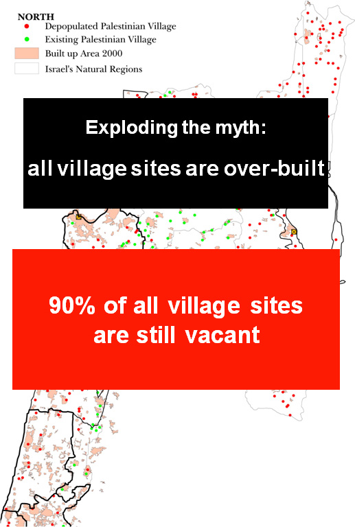 Another myth: villages are built over. Wrong. 90% of the villages sites are vacant. The built-over areas are around Tel Aviv, Haifa and West Jerusalem.