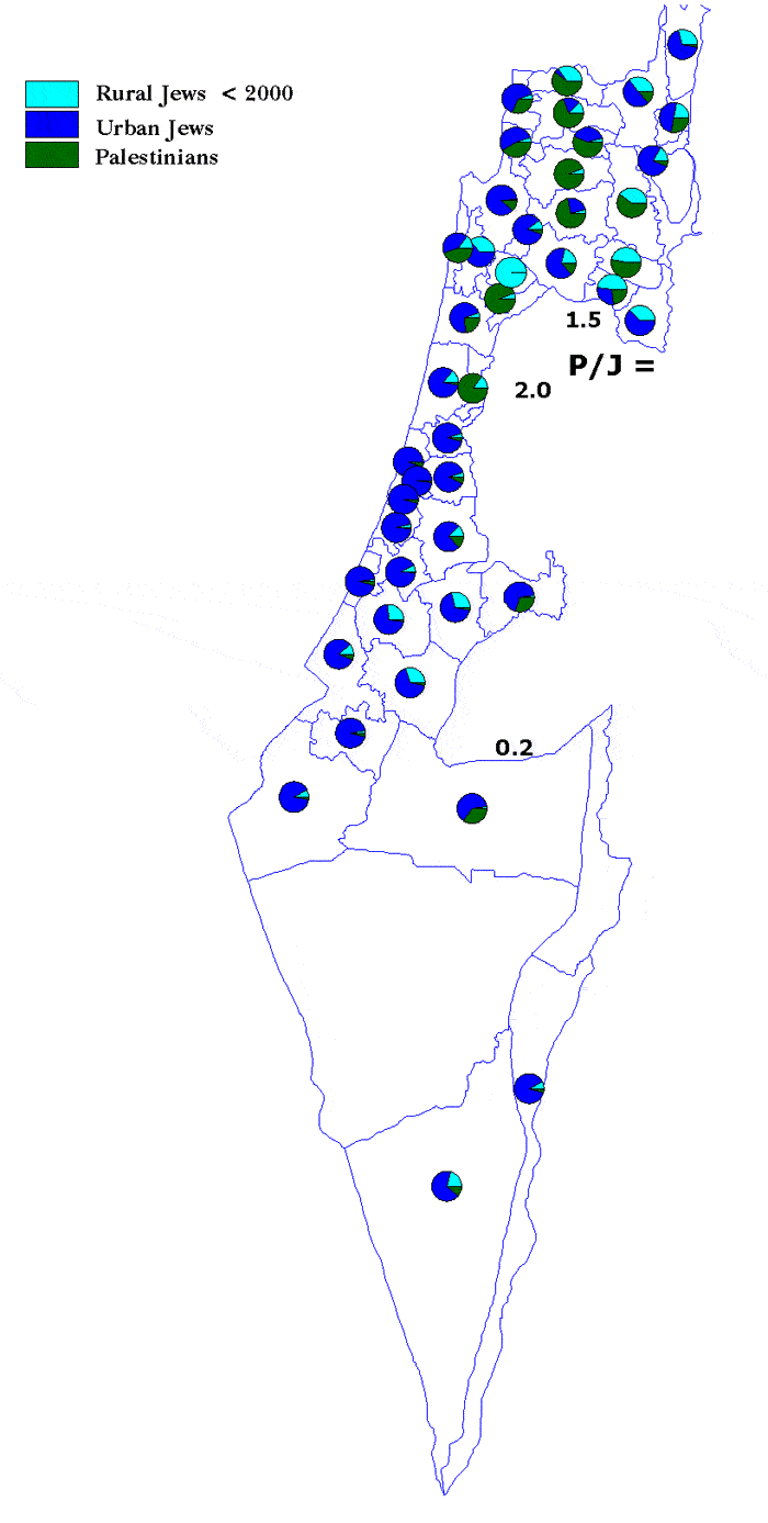 If they mean by the Jewish Character the numerical superiority of Jews, they have to think again. The Palestinians who remained in their homes now represent 26% of all Jews. They are everywhere. [Fig-6] In area A (the highest concentration of the Jews), they are 11% of the Jews. In the mixed area B, they are 21% of the Jews. In area C they are 70% of Jews on average, but they are double the number of Jews in the Little Triangle and 1.5 times the number of the Jews in Galilee. How could Israel ignore their presence? Will Israel plan another massive ethnic cleansing operation? Very unlikely. If attempted, there will be a sea of blood. They are there to stay, and increase. In the year 2010, Palestinians in Israel will be 35% of Jews and they will be equal to the number of Jews in 2050 or much earlier when immigration dries up. So what is the value of chasing an elusive target while innocent people wait in the refugee camps?