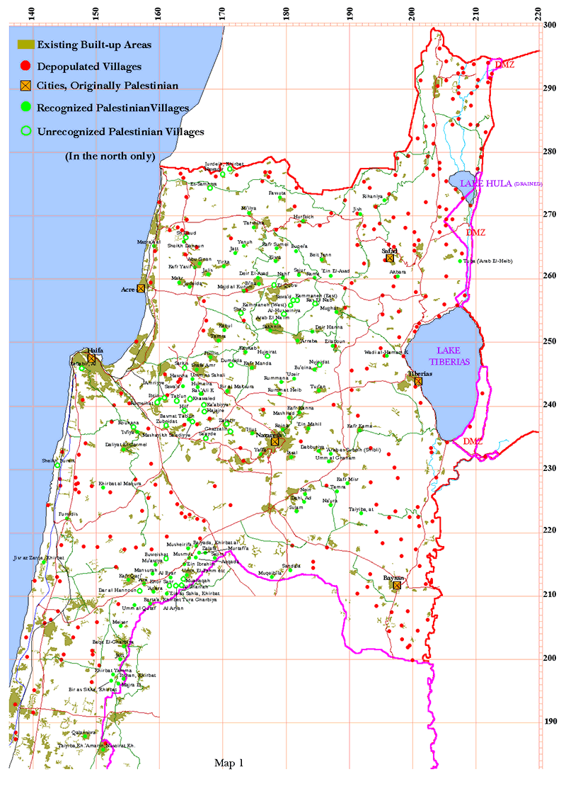 Let us consider two scenarios, which if applied are likely to diffuse much of the tension in the Middle East. Let us imagine that the registered refugees in Lebanon (362,000) are allowed to return to their homes in Galilee. Even today, Galilee is still largely Arab. Palestinians there outnumber the Jews one and a half times. If the Lebanon refugees return to their homes in Galilee, the Jewish concentration in Area A will hardly feel the difference, and the Jews will remain a majority in all areas, even when they are least in number, like Area C. To illustrate this, we plotted all existing built-up areas today and shown the location of the depopulated villages. [Fig-5] You can see clearly there is not the slightest interference, which shows that original villages can be rebuilt on the same spot.