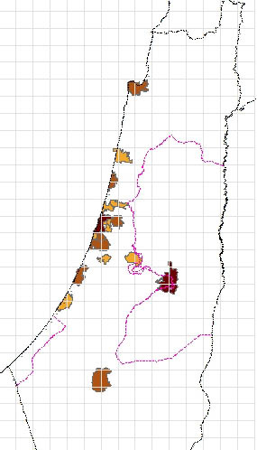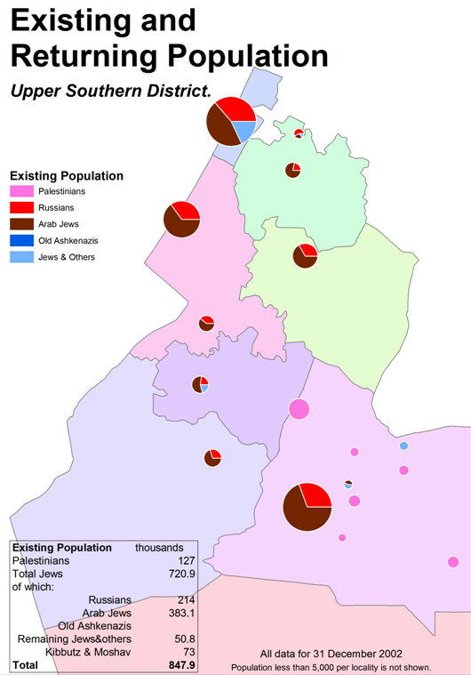 And here are the same municipal boundaries where Palestinians more than 30,000 [31,033] were living and can return to. (Area 10,244 km2, 50% of Israel’s area, pop 3.6m out of 4.43m RERE (81%), 42 MB out of 429.)