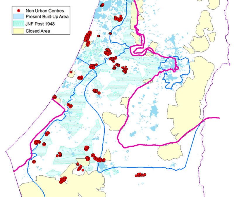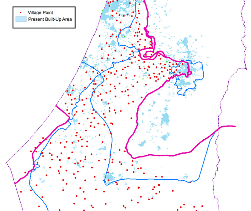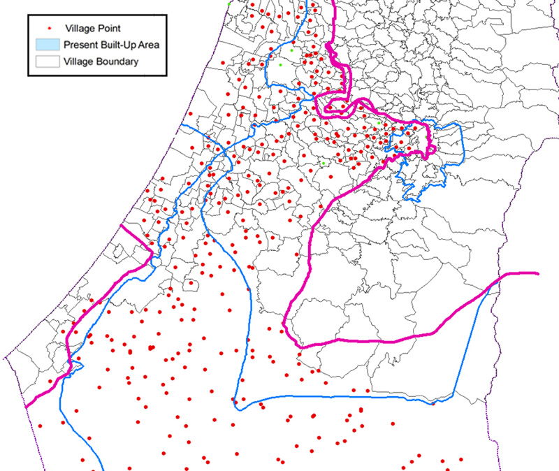 Let me give another example in greater detail of the area from Tel Aviv-Jerusalem corridor down south to Gaza. The red dots are the depopulated villages. The blue line is the partition plan. What happened when those villages were depopulated? The Israelis built the blue areas instead. As you can see, most of the village sites are still vacant.