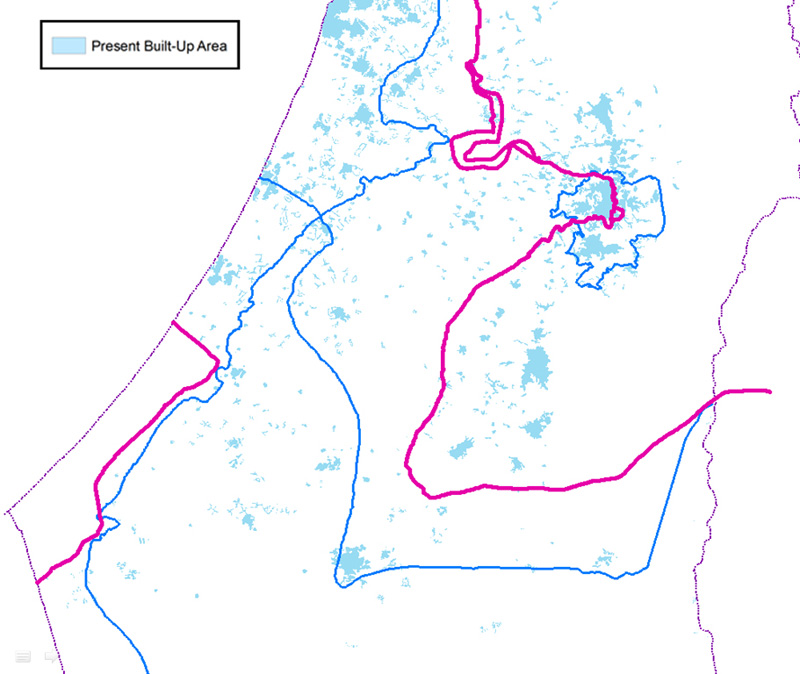 Here are the municipal boundaries where Israelis more than 50,000 [57,123] live. (Area 852 km2, 4% of Israel’s area, pop 3.4m out of 5.5m Jews, 20 MB out of 429.)