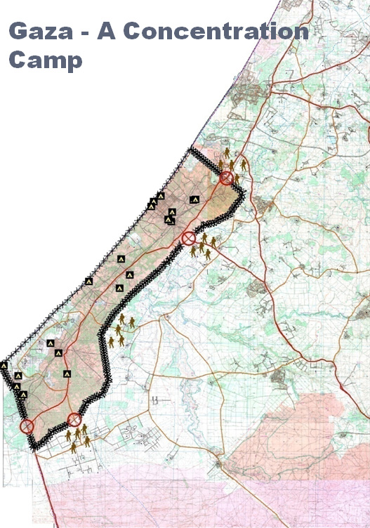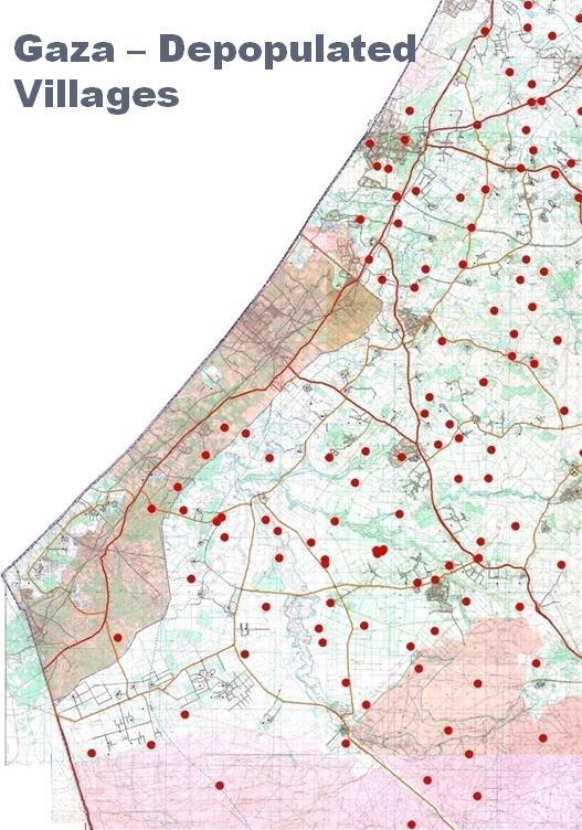 Take the case of Gaza, for example. All these red dots you see are depopulated Palestinian villages, now they are crammed in Gaza Strip. Why is Gaza heavily crowded? because that is where people from 274 villages in southern Palestine were driven into 8 refugee camps.