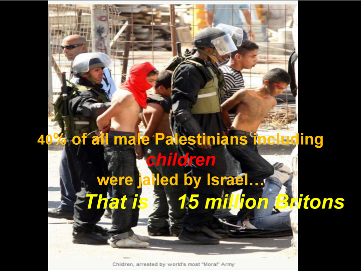 Arbitrary arrest, detention without trial and torture to death. This is the fate of most males and even children and women. From 1967 till today, 40% of all Palestinian males, including children, were jailed by Israel. If that was in Japan, it would be 25 million Japanese imprisoned at one point.