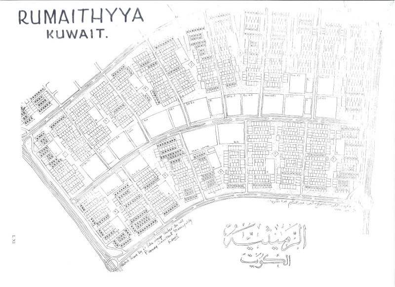Map-12 Kuwait 1960. Here is Kuwait before full development took place. In the middle of the picture by the sea, you see the American Hospital, and you can notice the empty spaces, as yet undeveloped. One of the talented Palestinian urban planners was Dr. Saba George Shiber. He was a good planner but also a philosopher who objected to the destruction of the old in favour of building a new Arab city. Map-13 Shiber Book cover. He thought the best was to learn from the past and convert it to an equivalent modern future. He wrote his experiences in two large volumes and left a lasting impression on Kuwait planning. Tragically he died at the young age of 40. One of his several works is the planning of Rumeithiya, Map-14 Rumaithiya. Today it is a thriving community just like dozens of neighbourhoods, built south of the First Ring Road. They are all successful neighbourhoods, as you can see today of the urban expansion up to the Seventh Ring Road.