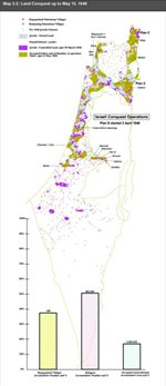 The red areas denote areas occupied by Zionist forces in this period. You will notice that they even violated the Partition Plan, which is advertized as the legal basis of founding Israel. There is no such legal foundation. The blue dots are the depopulated villages. There is more to it than that.