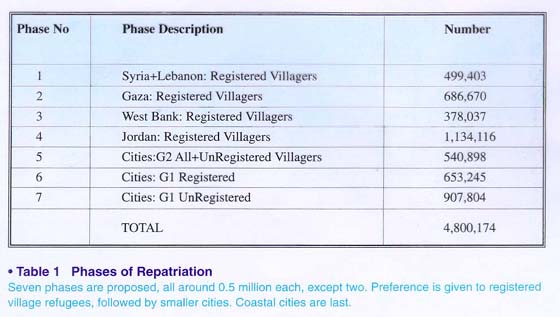 This phase refers to the return of 653,000 refugees back to the cities of Acre, Haifa, Jaffa, Lydda, Ramle and West Jerusalem (Group-1). Their return is often mentioned as a symbol for the return of all refugees. The Palestinian demonstrations, petitions and political statements often refer to the return to “Jaffa and Haifa”. The Israelis respond with ready-made answers and programmed fear: “This will dismantle Israel”. This symbolism refers however to a particular case and a small number of refugees. Even so, closer examination gives a more realistic picture.