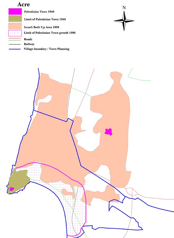 It is now necessary to examine the town plan of each city. This is done using (1) British Mandate town planning maps showing the built-up areas, town planning urban limit and the town’s rural land and (2) the built-up area of the city according to modern Israeli maps (year 1998) showing the extent of the present urban area. In order to compare 1948 and 1998 areas, Palestinian town’s area of 1948 is expanded, in the space available now, to reflect the present Palestinian population had they not been evicted. This is shown (in purple) in all diagrams of cities, together with 1948 (Palestinian) and 1998 (Israeli) urban limits.