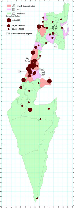 Group-B, 1,508 square kilometres in area, which is almost the same size but not the same location of the land owned by the Palestinians who remained in Israel after the 1948 war. (Since 1948, Israel has confiscated two-thirds of the property of its Palestinian citizens). In group-B, there are 436,000 Jews, or 9.6 percent of all the Jews in Israel, along with 92,000 of Israel's Palestinian citizens.