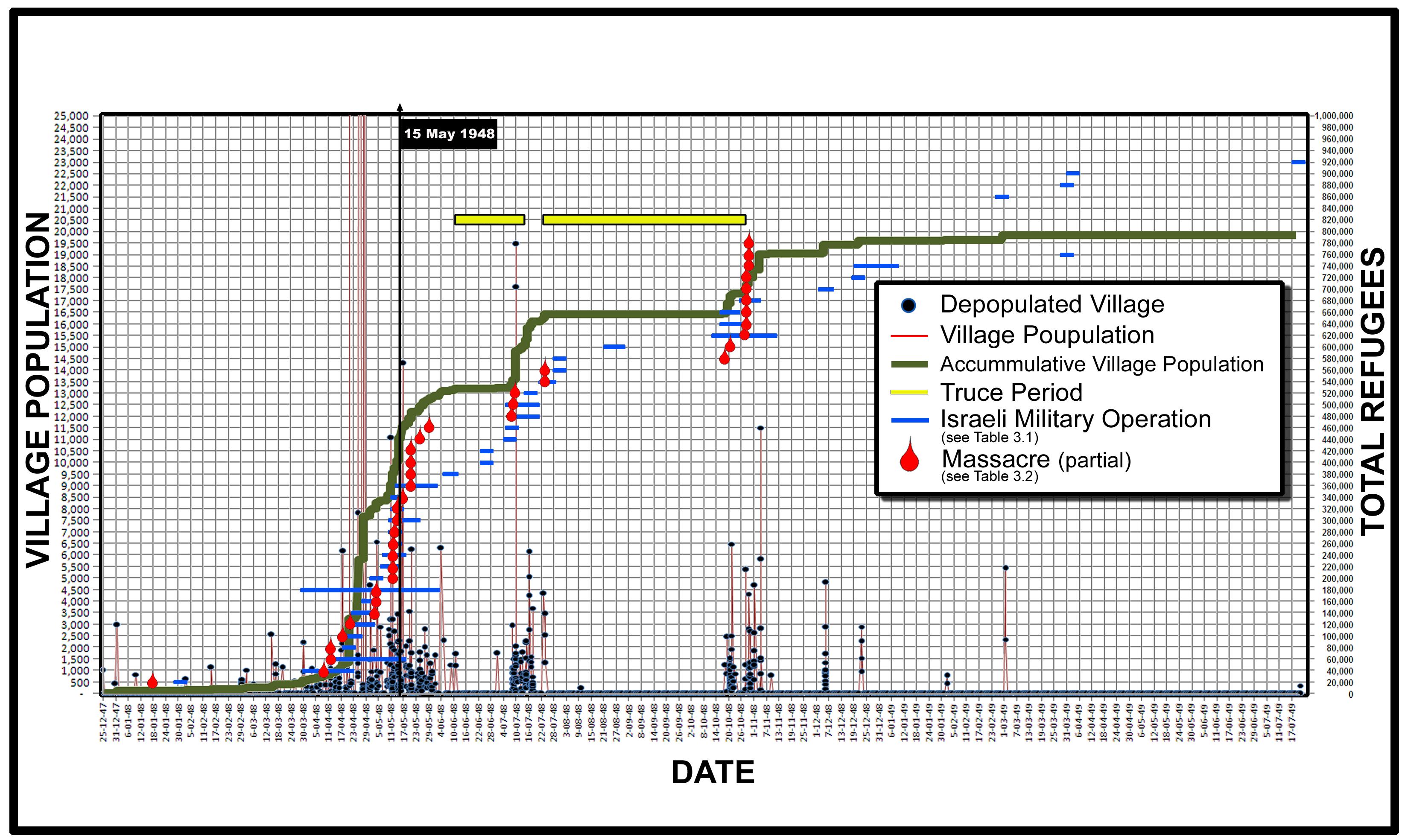 This diagram shows the rise of the exodus with the incidence of Israeli military operations. Note the complete correlation between the depopulation date of the villages and the Israeli assault operations. With the cessation of the military attacks, even for a brief period, the exodus ceased almost at once.