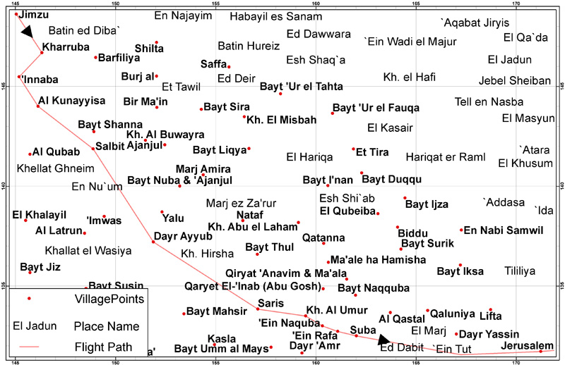 From: Jimzu Passing by: Kharruba, Salbit, Imwas, Dayr Ayyub, Saris, Suba To: Jerusalem Duration: 1 min 48 sec